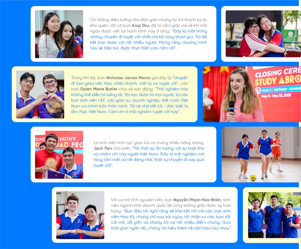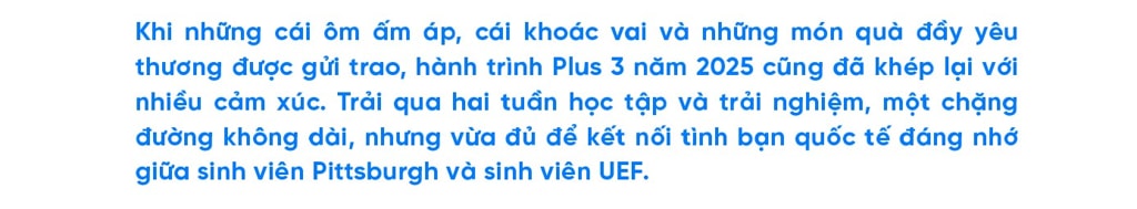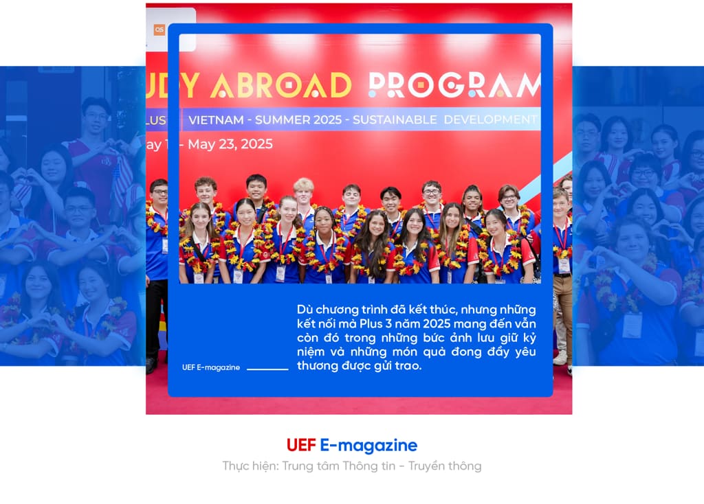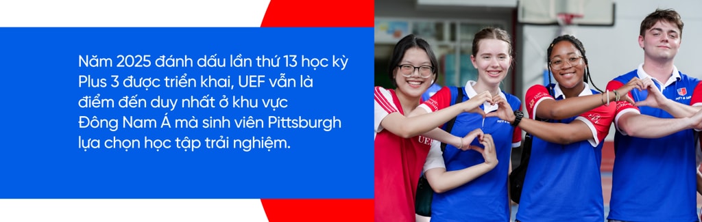 ![]() Bắt đầu từ năm 2013, qua 13 năm triển khai, Plus 3 là chương trình hợp tác quốc tế giữa Đại học Pittsburgh (Hoa Kỳ) và UEF, mang đến cơ hội cho sinh viên hai nước cùng học tập, trao đổi văn hóa và tìm hiểu môi trường thực tiễn doanh nghiệp tại Việt Nam. Mỗi năm, sinh viên Pittsburgh sẽ có thời gian học tập kéo dài hai tuần tại UEF, cụ thể sinh viên Hoa Kỳ được tham gia các buổi học chuyên đề, tham quan các doanh nghiệp, giao lưu với sinh viên UEF và khám phá đất nước hình chữ S thông qua nhiều hoạt động giao lưu, học tập sôi nổi.