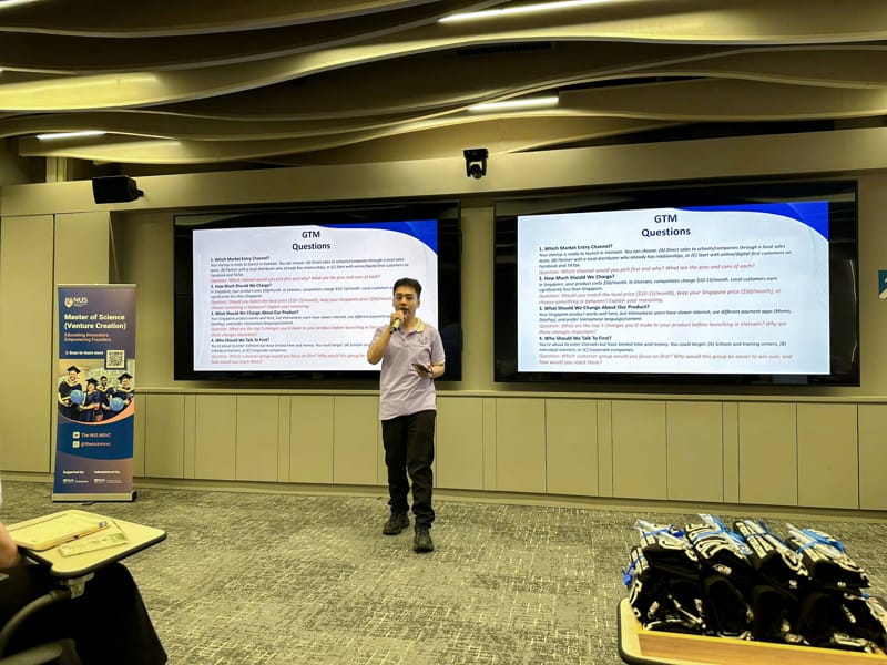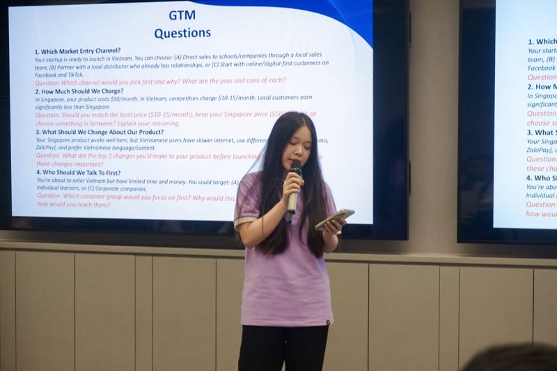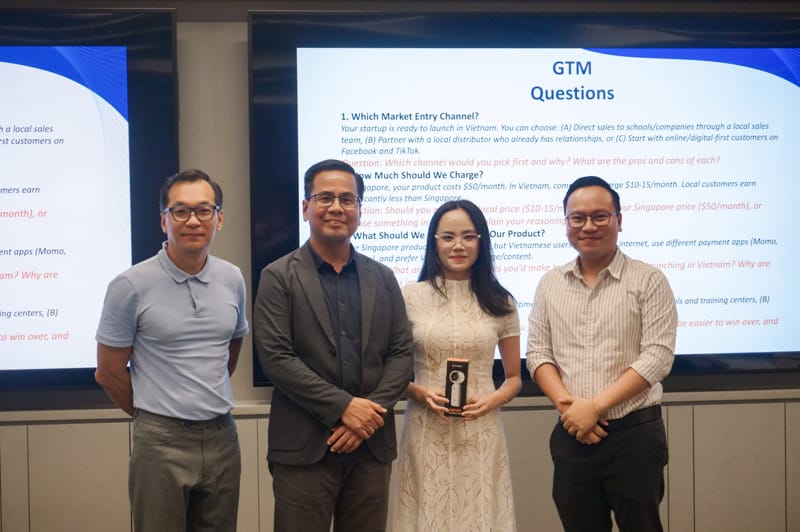 Sau phần chia sẻ, sinh viên được chia thành ba nhóm thảo luận, cùng phân tích vấn đề, đưa ra giải pháp và trình bày quan điểm trước ban giám khảo gồm giảng viên UEF và NUS. Hoạt động không chỉ kiểm tra kiến thức chuyên môn mà còn rèn luyện kỹ năng tư duy phản biện, làm việc nhóm và thuyết trình bằng tiếng Anh trong môi trường quốc tế. Kết thúc phần học thuật, chương trình trao hai giải thưởng gồm: Giải nhóm có câu trả lời xuất sắc và Giải cá nhân xuất sắc, ghi nhận nỗ lực và năng lực nổi bật của sinh viên UEF.
