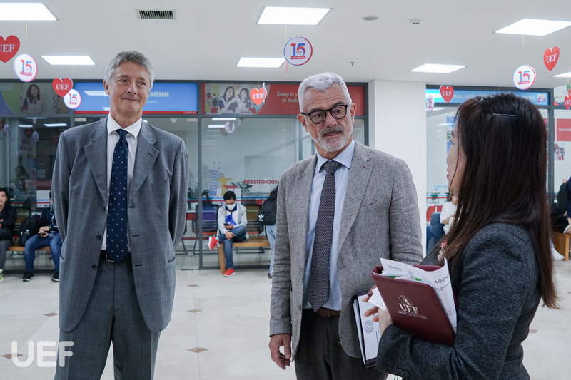 Đáp lại, TS. Marco Abbiati cho biết rất ấn tượng về cơ sở vật chất và chất lượng giáo dục tại UEF, qua đó ông gửi lời chúc mừng cho những thành tựu và mạng lưới sinh viên, đối tác UEF đang có. Ông cũng chia sẻ thêm: “Hiện tại, Italia ngày càng có nhiều chương trình được giảng dạy bằng tiếng Anh và Chính phủ đang mở rộng hợp tác, liên kết quốc tế trong mảng giáo dục”.
