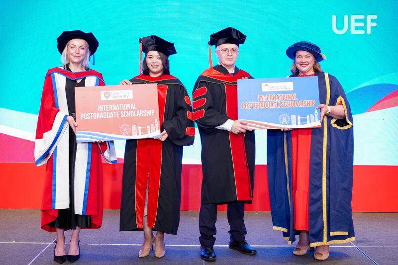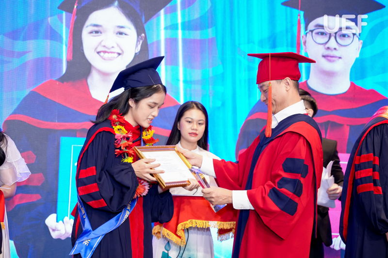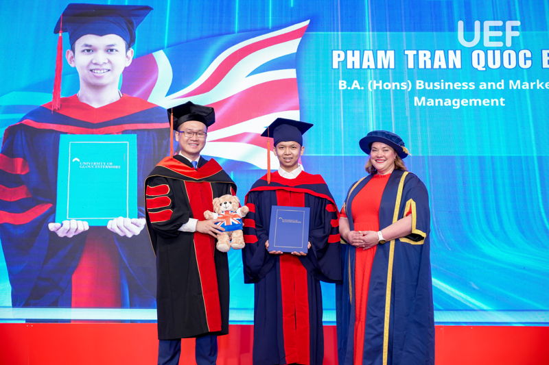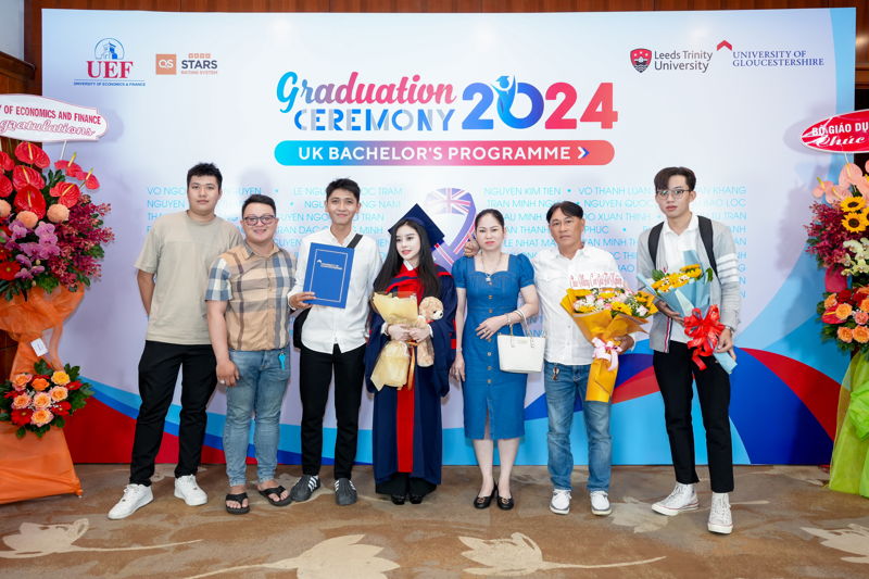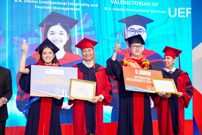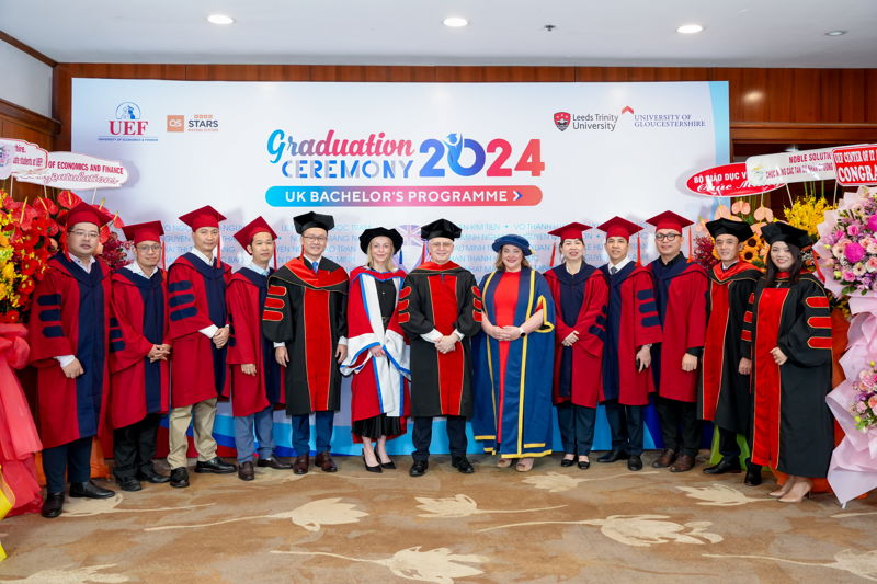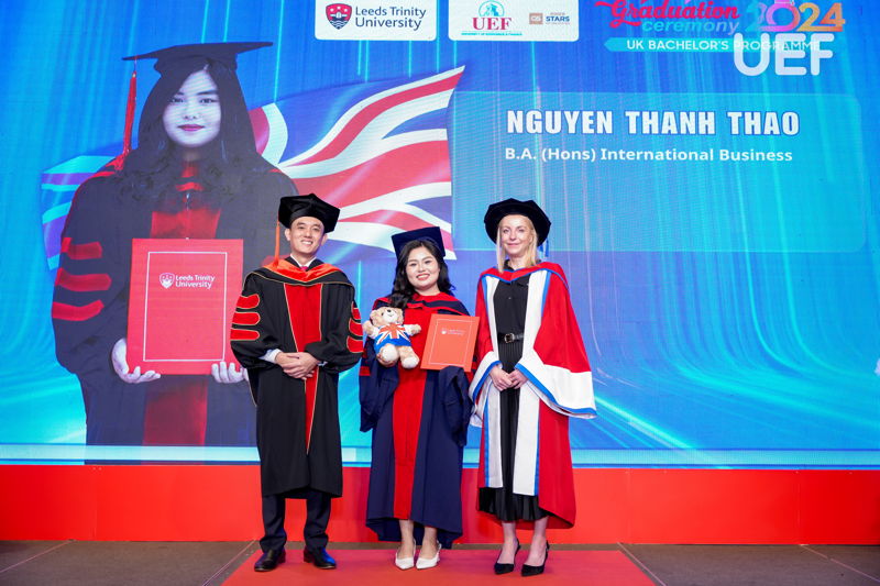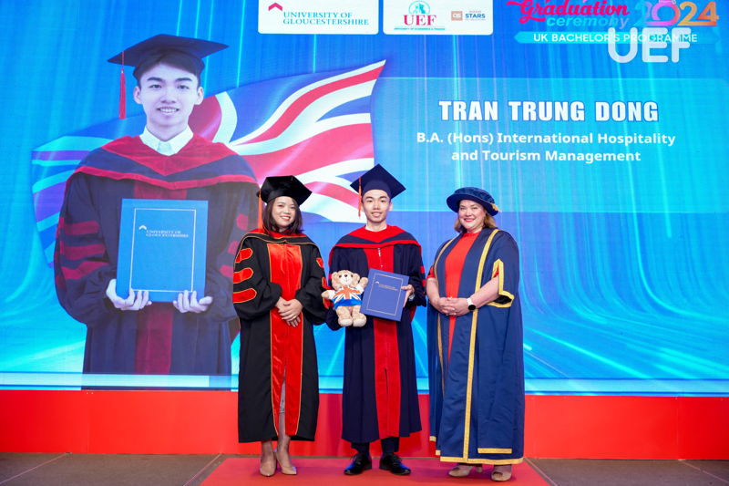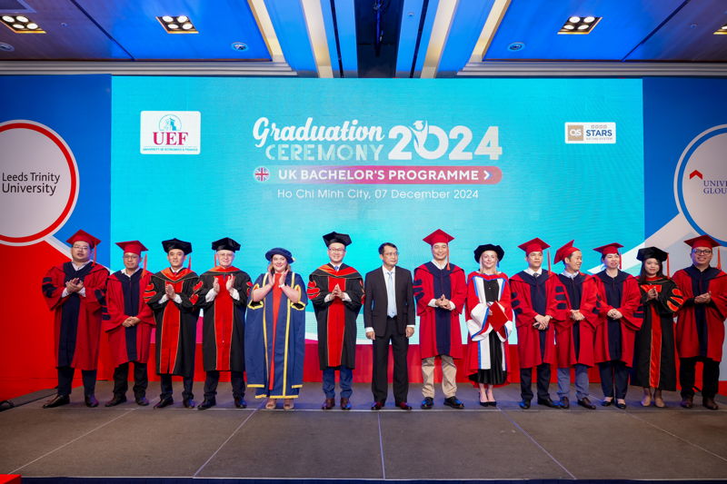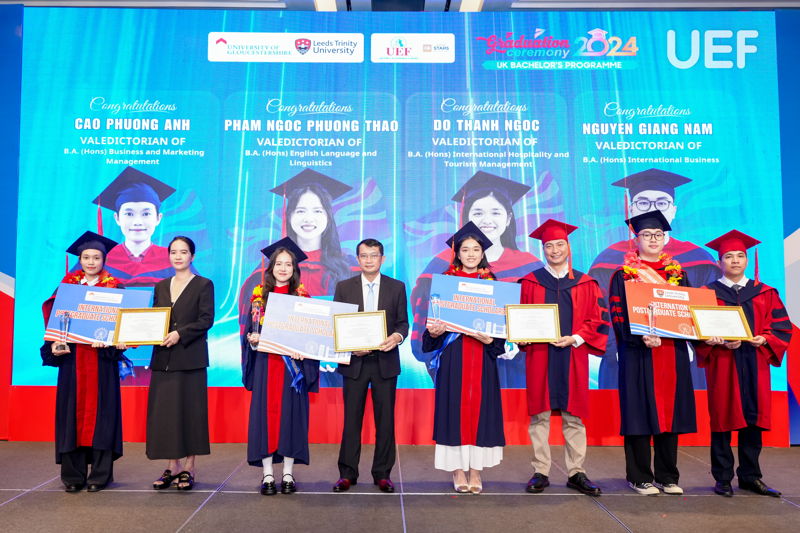 Đợt tốt nghiệp này, UEF cùng Leeds Trinity và Gloucestershire đã trao bằng cho 63 sinh viên tốt nghiệp các ngành Quản trị kinh doanh và Marketing, Tiếng Anh và Ngôn ngữ học, Quản trị du lịch và khách sạn quốc tế, Kinh doanh quốc tế. Vượt lên trên cả sự cố gắng, 4 gương mặt ưu tú nhất về thành tích học tập đã xuất sắc chạm tay đến danh hiệu Thủ khoa các ngành. Nhà UEF đã vinh danh và chúc mừng các bạn một cách trang trọng và đầy tự hào nhất. Mọi sự cố gắng và nỗ lực ấy đã được ghi nhận và tuyên dương.