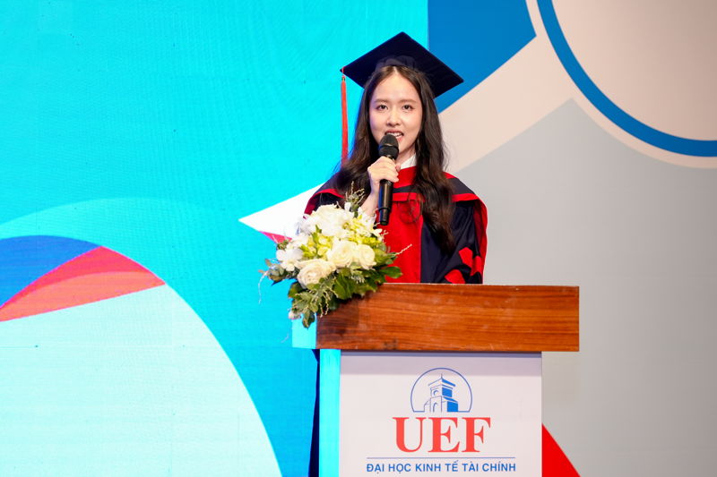 Thủ khoa Phạm Ngọc Phương Thảo - đại diện các tân cử nhân chia sẻ tại lễ tốt nghiệp