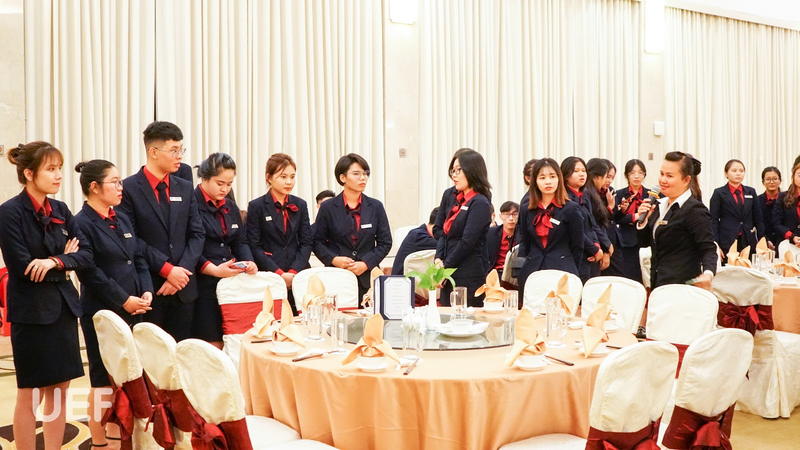 Ở mỗi bộ phận, sinh viên được học từng nội dung cụ thể. Tại nhà hàng, các bạn được tìm hiểu về cách trình bày, trang trí bàn tiệc theo phong cách châu Á, châu Âu. Khi tham quan các bộ phận buồng phòng, UEFers được thực hành trải chăn, ga giường một cách chuyên nghiệp. Ở khu vực quầy bar, sinh viên được tìm hiểu về sự vận hành của quầy bar và sơ lược về các loại rượu.