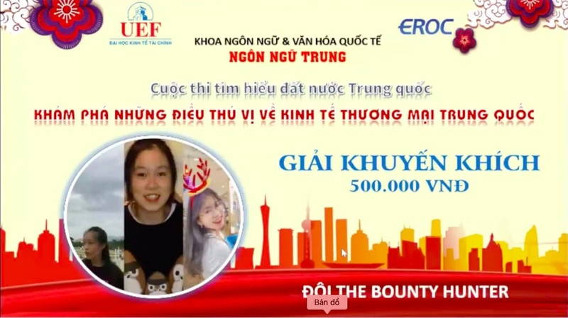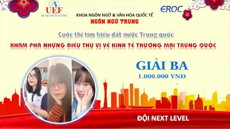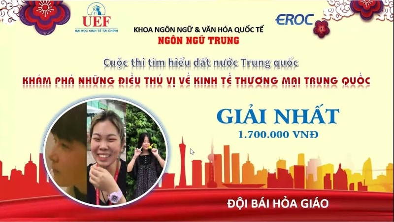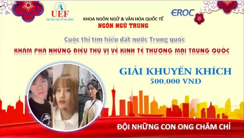 Với chủ đề “Khám phá những điều thú vị về kinh tế thương mại Trung Quốc", vòng Chung kết cuộc thi "Tìm hiểu đất nước Trung Quốc" diễn ra chiều 5/8 đã tìm ra được những đội chơi xuất sắc, thể hiện tinh thần tìm tòi, học hỏi của sinh viên khoa Ngôn ngữ và Văn hóa quốc tế nói riêng và sinh viên Nhà UEF nói chung.