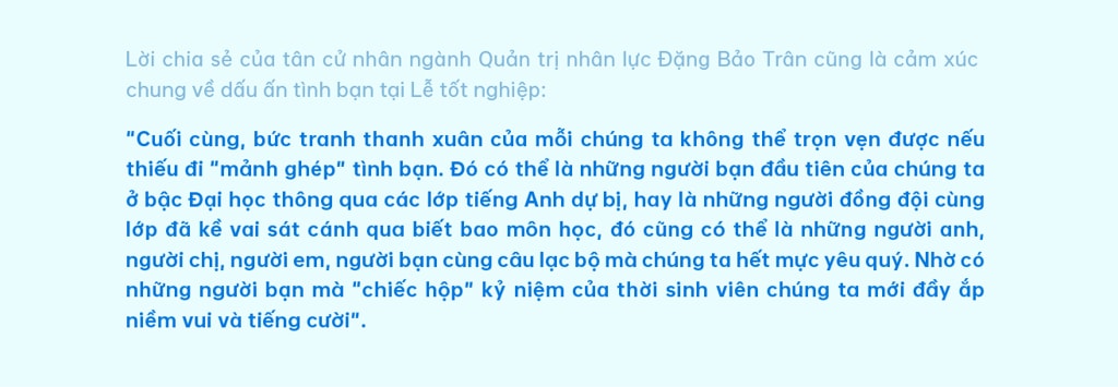 Lễ tốt nghiệp đã ghi dấu những nụ cười, những cái khoác vai và những hành động ân cần, quan tâm dành cho nhau. Có thể sau khi ra trường, các bạn không còn gặp nhau, nhưng mối “duyên lành” từ Nhà UEF đủ để các bạn luôn chúc nhau tỏa sáng và thành công ở chặng đường mới.