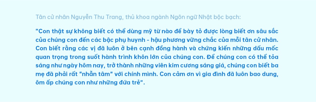 Trên hành trình học tập và rèn luyện, các bạn không đơn độc, ở đó luôn có sự đồng hành của “hậu phương” vững chắc. Những bậc phụ huynh đã luôn lo lắng, chăm sóc và mang đến nguồn trợ lực to lớn; những người thầy, người cô đã không ngừng truyền đạt kiến thức và chỉ dẫn tận tình…