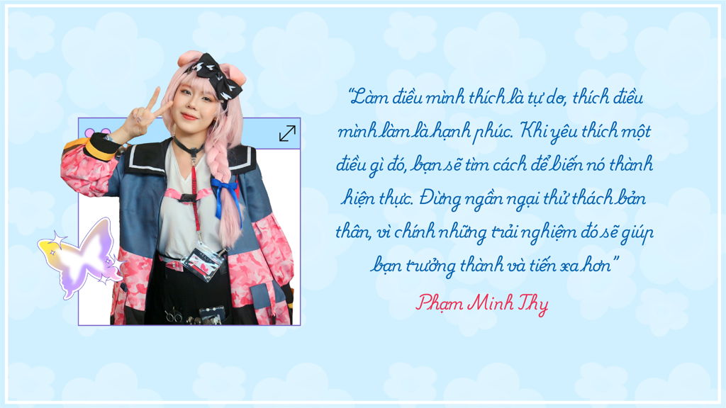 Cosplay không đơn thuần là một sở thích, mà đối với Minh Thy, đó còn là một cầu nối giúp bạn tiến gần hơn với nền văn hóa Nhật Bản. Nghệ thuật hóa thân thành những nhân vật trong anime, manga vừa mang lại niềm vui, cũng vừa là cơ hội để Minh Thy phát triển bản thân. “Cosplay giúp em được sống trong thế giới của những nhân vật mình yêu thích, thể hiện thần thái, cá tính của họ qua từng cử chỉ, hành động. Từ đó cảm nhận được sâu sắc hơn những giá trị và tinh thần mà văn hóa Nhật Bản mang lại”, bạn cho biết.