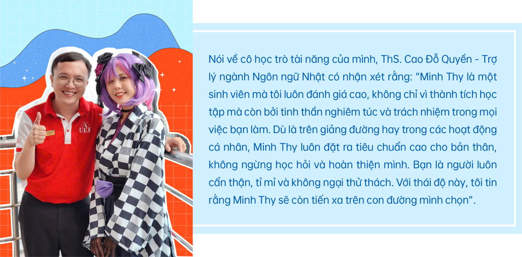 Là một môi trường học tập năng động, UEF đã tạo điều kiện để Minh Thy phát triển cả về chuyên môn lẫn kỹ năng mềm. Cô bạn đặc biệt trân trọng những hoạt động ngoại khóa tại trường, nơi bản thân có thể thử sức với nhiều vai trò khác nhau với sự đồng hành nhiệt tình từ thầy cô, bạn bè. Việc tham gia Câu lạc bộ tiếng Nhật Hikari, các cuộc thi văn hóa nghệ thuật và các sự kiện giao lưu với sinh viên nước ngoài,... đã giúp Minh Thy mở rộng tầm nhìn, gặp gỡ nhiều người bạn cùng chí hướng và trưởng thành hơn từng ngày.