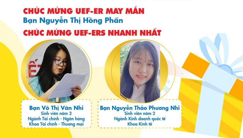 Với vốn trải nghiệm phong phú và tốc độ vượt trội, 2 bạn Nguyễn Thảo Phương Nhi - Khóa 2019 khoa Kinh tế và bạn Võ Thị Vân Nhi - Khóa 2019 khoa Tài chính - Thương mại đã trở thành UEFers nhanh nhất kỳ thứ 5. Đồng thời, Ban tổ chức cũng ghi nhận bạn Nguyễn Thị Hồng Phấn là cái tên may mắn trong tuần này.