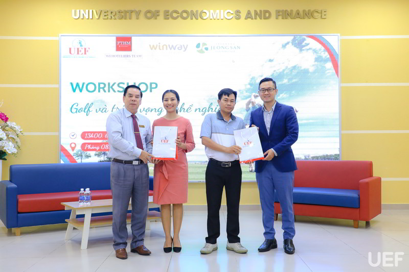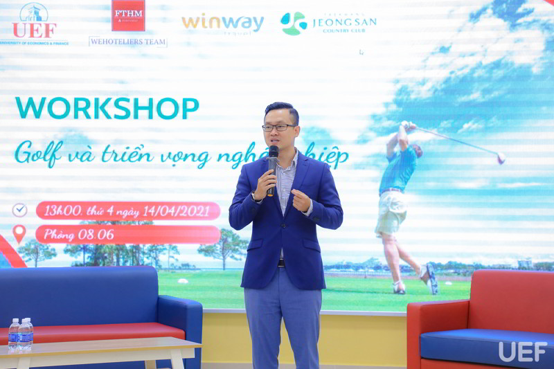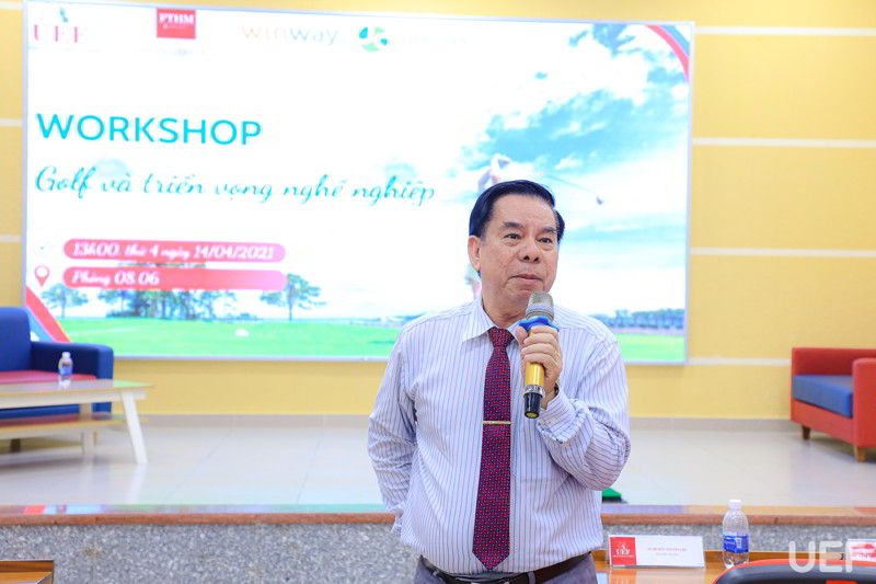 Phát biểu mở đầu chương trình, TS. Đỗ Hữu Nguyên Lộc – Phó Hiệu trưởng UEF chia sẻ những góc nhìn về bộ môn Golf: “Đây được xem là bộ môn thời thượng và có rất nhiều điều thú vị. Tại UEF, với định hướng quốc tế, thuộc top trường “sang chảnh”, các bạn sinh viên hoàn toàn được hưởng chế độ học tập cũng như là những bộ môn thể thao phù hợp với mình. Golf là môn thể thao đã được Nhà trường nghiên cứu rất lâu và cho đến bây giờ là dịp để sinh viên được biết và có cơ hội tham gia bộ môn này nhiều hơn. Hy vọng sau workshop hôm nay, ngoài việc chúng ta hiểu hơn về Golf, tìm được cơ hội làm việc trong ngành nghề triển vọng này. Nhà trường cũng sẽ có cơ hội kết nối với doanh nghiệp để đưa Golf trở thành môn thể thao chính thức được giảng dạy tại UEF.”