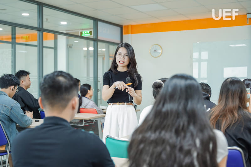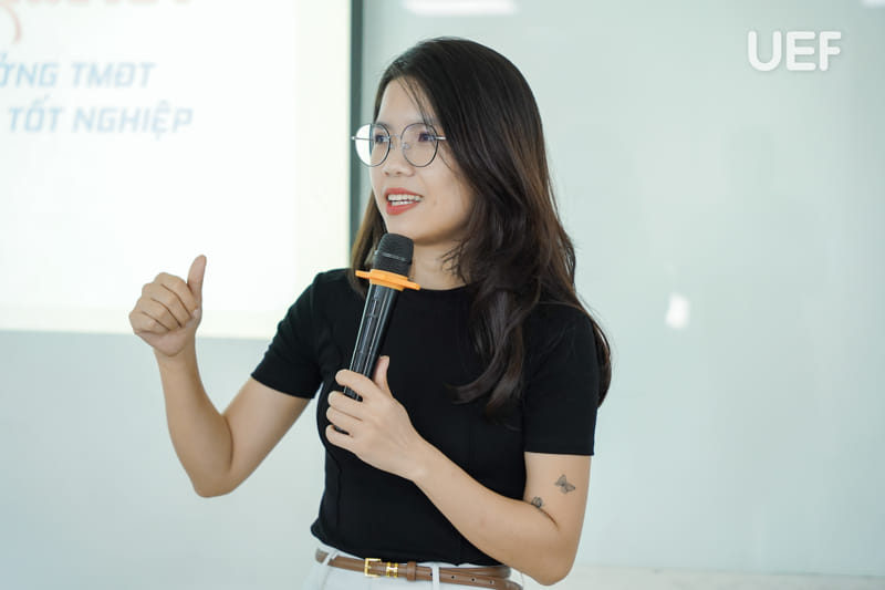 Đồng hành với các bạn sinh viên trong hành trình hiện thực hóa ý tưởng, ThS. Hoàng Thị Hằng - Trợ lý Trưởng Khoa Công nghệ thông tin, đã mang đến những định hướng giá trị, giúp các bạn sinh viên có thể khai thác tối đa năng lực sáng tạo và biến ý tưởng Thương mại điện tử thành dự án tốt nghiệp chất lượng cao. Cô đã mang đến cho các UEFers những kiến thức thiết thực, giúp các bạn định hướng đề tài, nắm vững quy trình triển khai chuyên đề và nhận diện cơ hội phát triển nghề nghiệp trong lĩnh vực Thương mại điện tử.