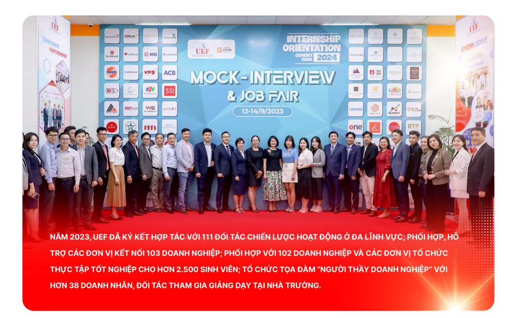 ![]() Một trong những dấu ấn của UEF suốt chặng đường vừa qua là phát triển số lượng lẫn chất lượng cán bộ - giảng viên - nhân viên. Các hoạt động từ đào tạo, dịch vụ chăm sóc sinh viên, hỗ trợ học tập đến hoạt động dành cho sinh viên được triển khai liên tục và tạo điều kiện. Nhiều hoạt động, phong trào có kết quả cao. ![]() Nhà trường đào tạo bậc cử nhân với 34 ngành học ở các lĩnh vực kinh doanh, quản lý, tài chính, truyền thông, luật, ngôn ngữ, khoa học xã hội,...; 5 ngành trình độ thạc sĩ gồm Quản trị kinh doanh, Tài chính - Ngân hàng, Kế toán, Luật Kinh tế, Ngôn ngữ Anh và đào tạo Tiến sĩ ngành Quản trị kinh doanh. ![]() Là trường đại học phát triển theo mô hình giáo dục quốc tế, giúp sinh viên phát triển toàn diện và trở thành công dân toàn cầu, UEF không ngừng tìm kiếm và mở rộng mạng lưới đối tác quốc tế trong suốt những năm qua.
