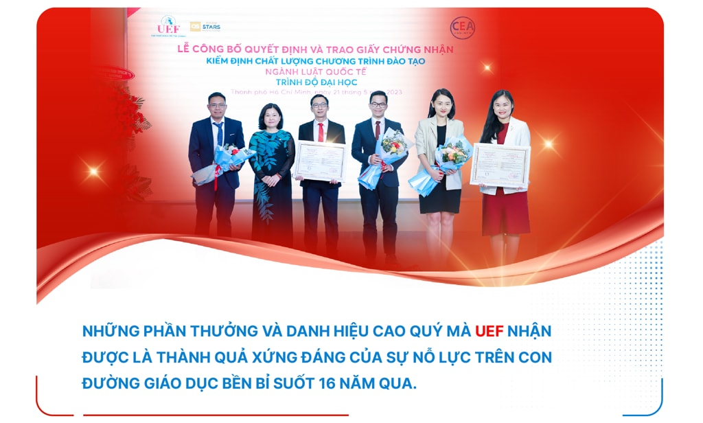Trên hành trình 16 năm đầy nỗ lực, UEF đã từng bước đổi mới, hội nhập để thích ứng kịp thời với sự phát triển cùng những biến đổi của thời cuộc. Đến hôm nay, Nhà trường tự hào đã đào tạo ra các thế hệ sinh viên ưu tú, được các doanh nghiệp tin tưởng và đánh giá cao. Với tinh thần cầu thị và sứ mệnh đào tạo nguồn nhân lực chất lượng cao đáp ứng nhu cầu xã hội, UEF với những thành tựu trong suốt chặng đường vừa qua sẽ làm động lực để trở thành một trong những trường đại học hàng đầu Việt Nam, có uy tín trong khu vực như tầm nhìn đặt ra.