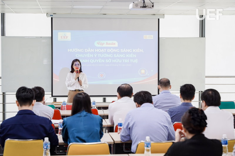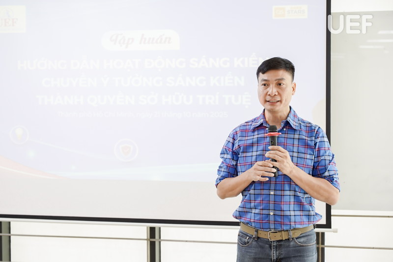Sáng ngày 20/10, Phòng Khoa học công nghệ và Dự án quốc tế UEF đã tổ chức chương trình tập huấn “Hướng dẫn hoạt động sáng kiến, chuyển ý tưởng sáng kiến thành quyền sở hữu trí tuệ” dành cho đội ngũ cán bộ - giảng viên - nhân viên (CB-GV-NV). Hoạt động nằm trong kế hoạch nâng cao hiệu quả triển khai sáng kiến, đồng thời thực hiện mục tiêu chất lượng năm học 2025-2026 về công tác khoa học và công nghệ của Nhà trường.