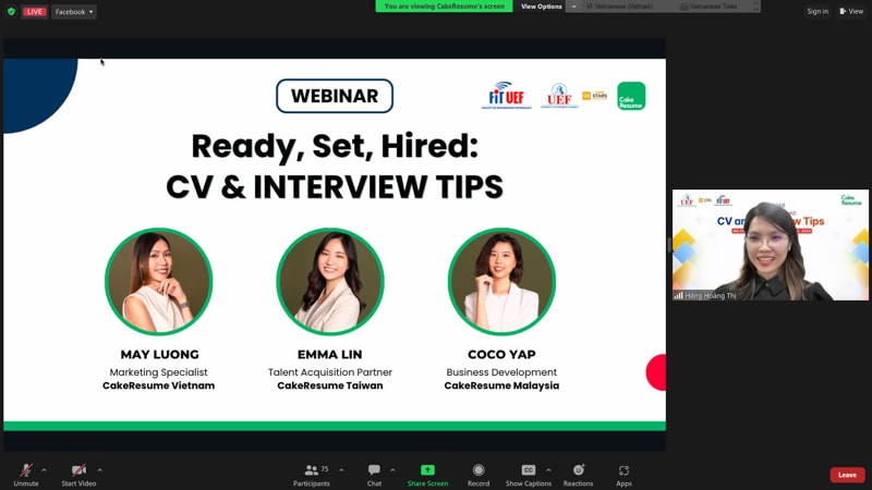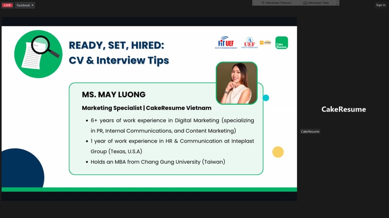 Trên nền tảng trực tuyến Zoom, chương trình có sự đồng hành của 3 diễn giả với nhiều năm kinh nghiệm trong lĩnh vực tuyển dụng và phỏng vấn ứng viên song ngữ: Ms. Emma Lin – Talent Acquisition Partner/CakeResume Taiwan, Ms. Coco Yap – Business Development Representative/CakeResume Malaysia, Ms. May Luong – Marketing Specialist/CakeResume Vietnam. Host của chương trình là ThS. Trần Thành Công - Trợ lý Trưởng Khoa, Trưởng ngành Thương mại điện tử và ThS. Hoàng Thị Hằng - Giảng viên ngành Thương mại điện tử.