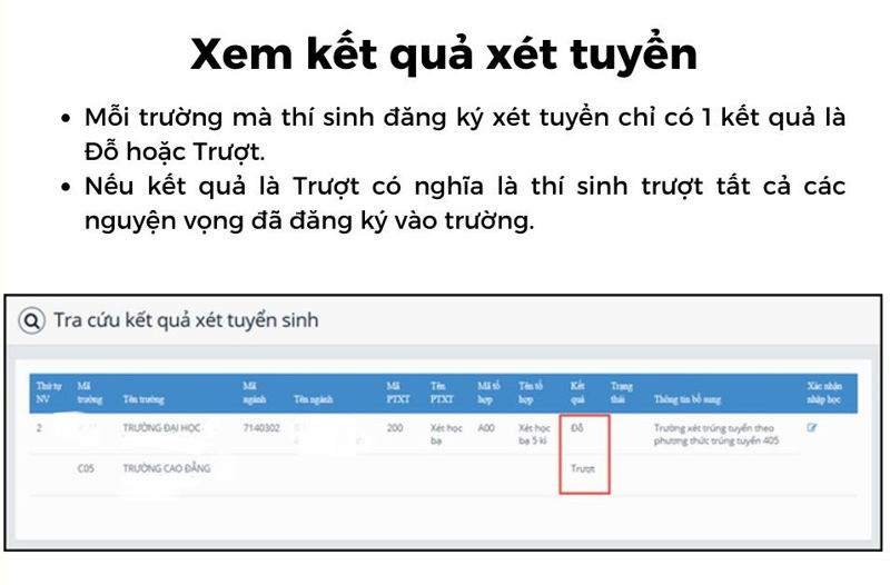 Mỗi trường mà thí sinh lựa chọn đăng ký xét tuyển chỉ có một kết quả là Đỗ hoặc Trượt. Nếu trường hợp Đỗ, thí sinh tiến hành các bước tiếp theo, trường hợp còn lại nghĩa là thí sinh không may mắn trượt tất cả các nguyện vọng đã đăng ký vào trường.
