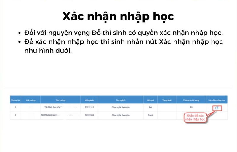Đối với nguyện vọng đã Đỗ, thí sinh có quyền xác nhận nhập học ngay. Để xác nhận nhập học thí sinh nhấn nút Xác nhận nhập học như hình dưới.