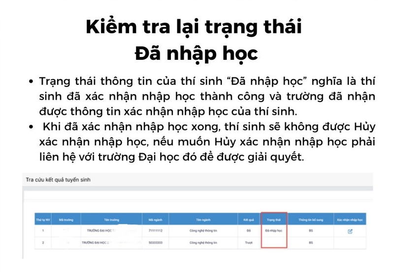 Khi thí sinh ghi nhận được trạng thái “Đã nhập học” nghĩa là các bạn đã xác nhận nhập học trực tuyến trên cổng thông tin của Bộ GD&ĐT thành công. Song song đó, trên hệ thống của trường mà thí sinh đăng ký cũng cùng lúc ghi nhận thông tin trên.
