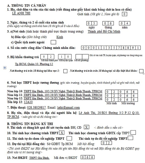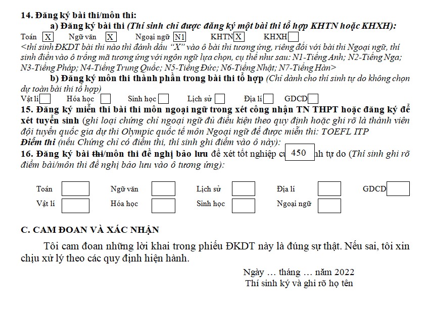 Hồ sơ đăng ký dự thi tốt nghiệp THPT năm 2022 chỉ bao gồm các thông tin dành cho thi tốt nghiệp THPT: (1) Thông tin cá nhân; (2) Thông tin đăng ký dự thi; (3) Cam đoan và xác nhận. Trong đó, phần thông tin cá nhân, thí sinh ghi đầy đủ, chính xác các thông tin theo yêu cầu.