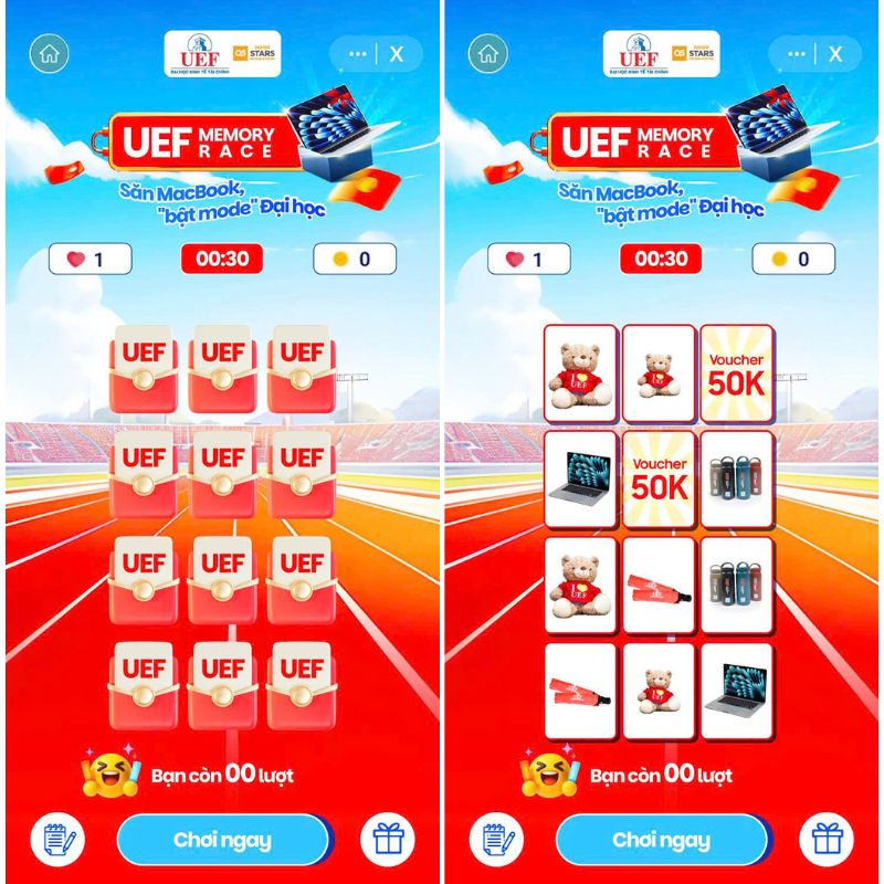 Trong giai đoạn cao điểm chuẩn bị cho kỳ thi tốt nghiệp THPT và lựa chọn con đường đại học, bên cạnh các hoạt động tư vấn tuyển sinh trực tiếp tại trường THPT, Nhà UEF còn triển khai minigame “UEF Memory Race - Săn MacBook, bật mood Đại học” trên nền tảng Zalo Mini App dành cho học sinh THPT trên toàn quốc.
