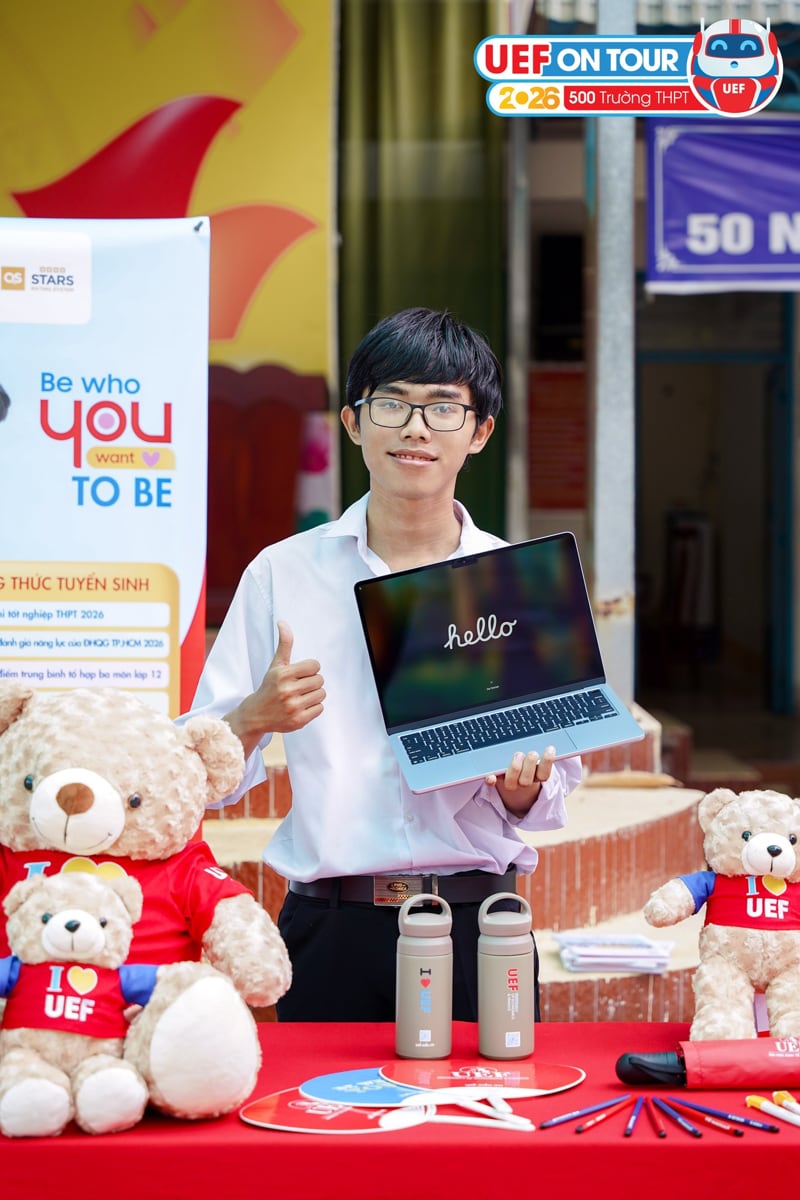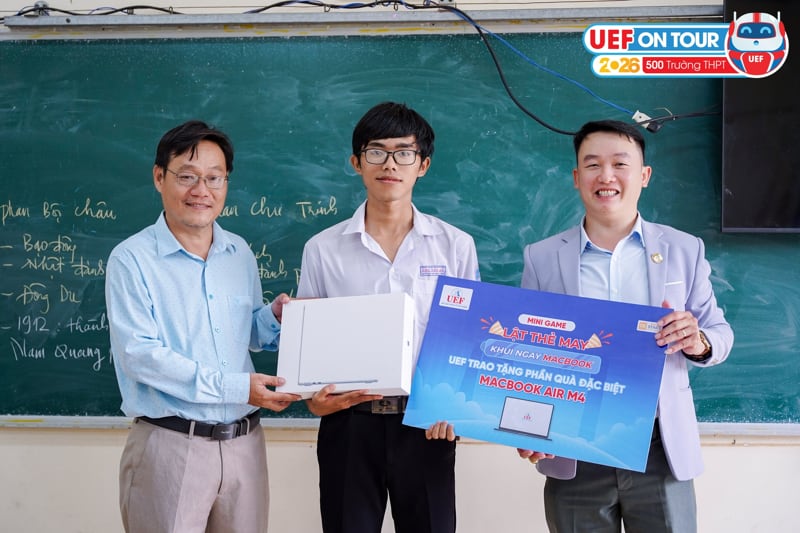 Minh chứng rõ nét cho sức lan tỏa và giá trị thực tiễn của các hoạt động tương tác số do UEF triển khai, vừa qua, UEF cũng đã trực tiếp có mặt tại tỉnh An Giang để trao một chiếc MacBook Air cho bạn Nguyễn Mai Thái Phong - học sinh lớp 12, Trường THPT Chu Văn An. Phần quà ý nghĩa này ghi nhận sự tham gia tích cực và bền bỉ của Thái Phong trong hơn hai tháng đồng hành cùng các minigame trên Zalo Mini App “UEF University”.